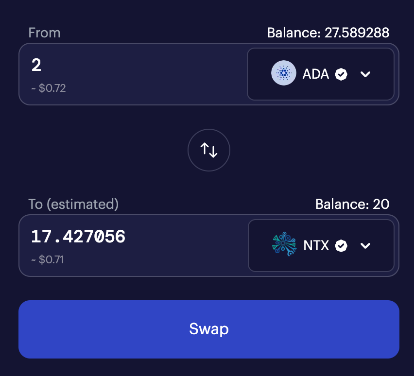 Users of Eternl wallet can swap ADA for NTX directly in the wallet. It uses the Muesliswap DEX aggregator to swap from whichever Cardano DEX has sufficient liquidity.