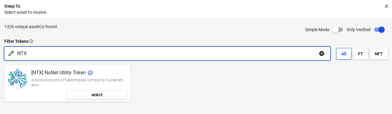 - Use "Click To Select" to open the search window, and type in "NTX" and click "select" (only use the verified token with the blue checkmark).