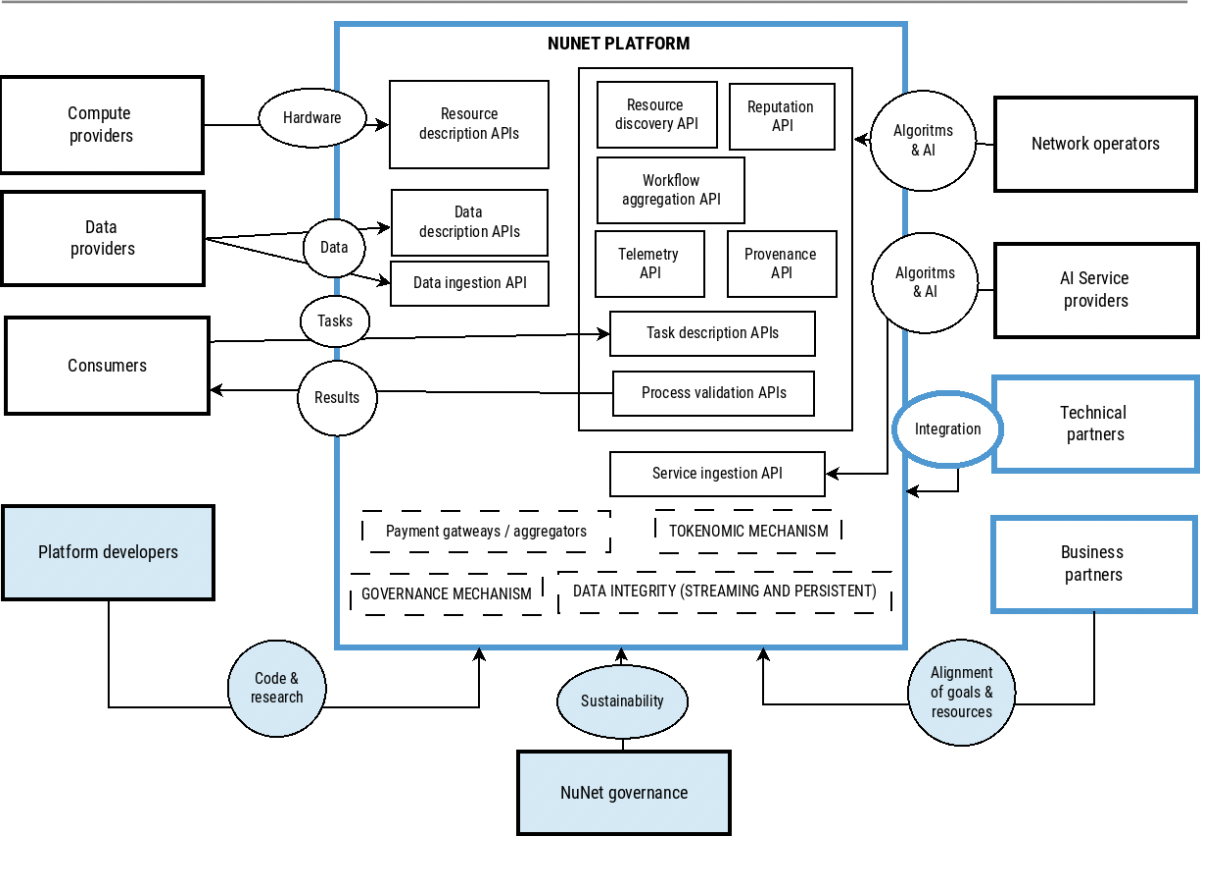 NuNet platform is an open-ended collection of pluggable open API, enabling providers, consumers and network operating agents to autonomously construct ad-hoc computational workflows from available components.